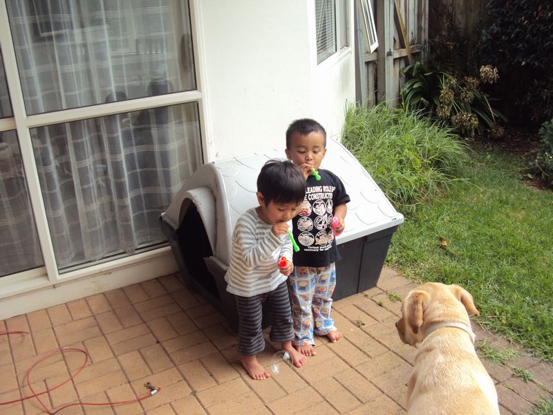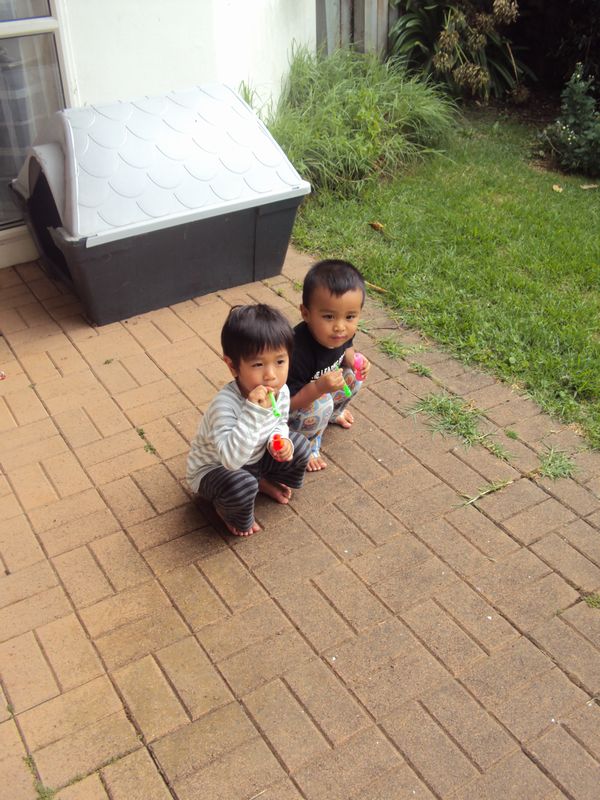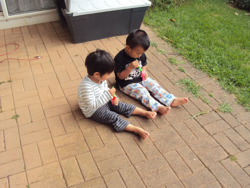 おもしろいことに、この2歳児2人、常に隣にポジションをとってシャボン玉を楽しみます。