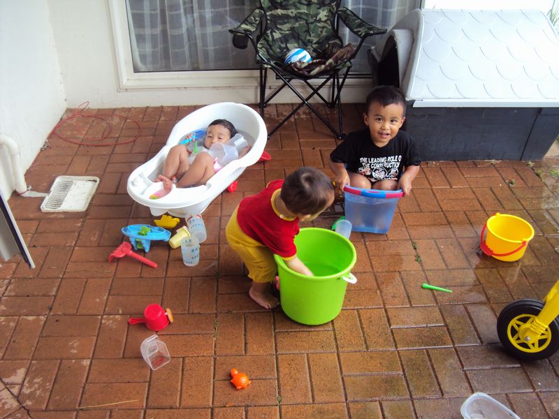 戻って、庭でしゃぼんだまをやっているうちに水遊びがしたくなり、