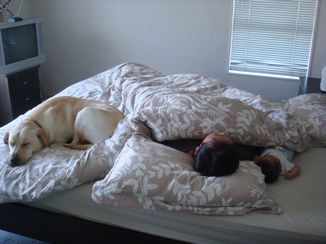2人と1匹、仲良くベットを分け合って・・・
