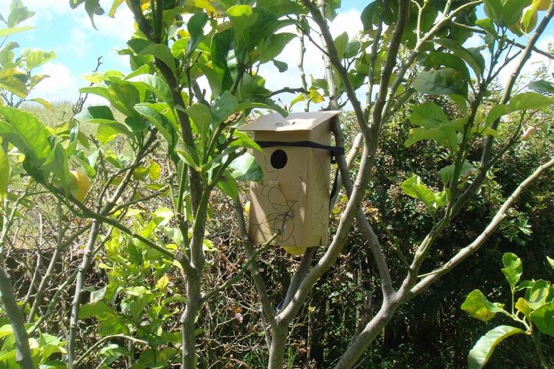 びっくりの後は、プレイセンターでもらったクリスマスプレゼントの巣箱をレモンの木に設置・・・