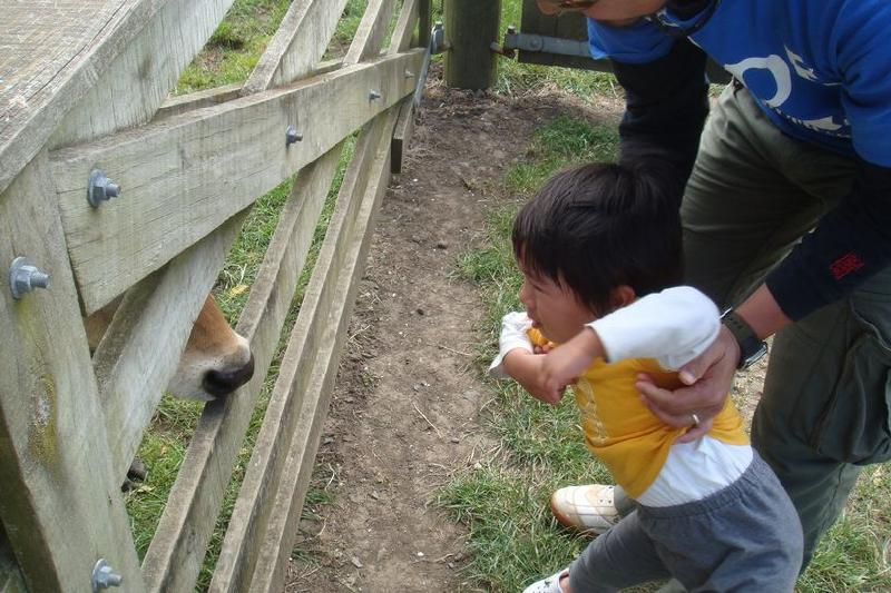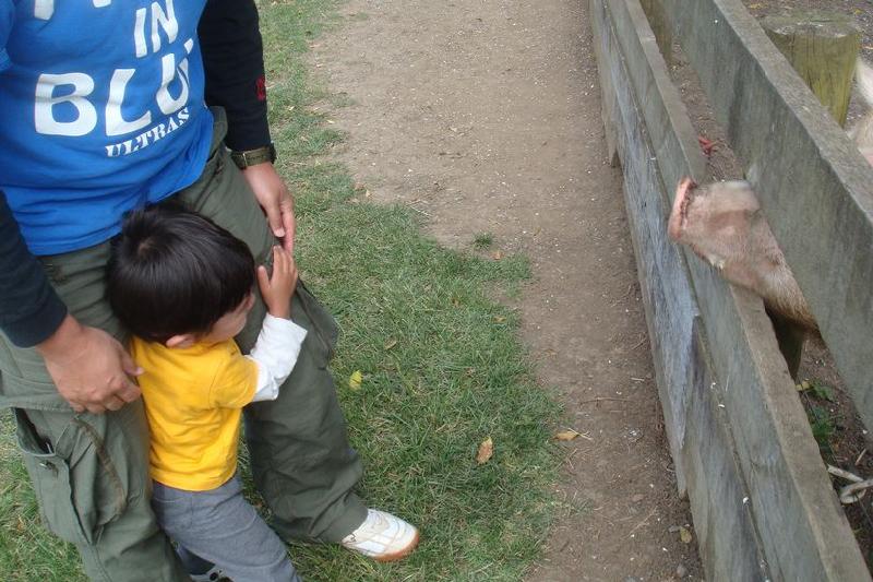 ぶたのシャーロットには後ずさり・・・『こあい、こあい』とダディーにしがみつく。
