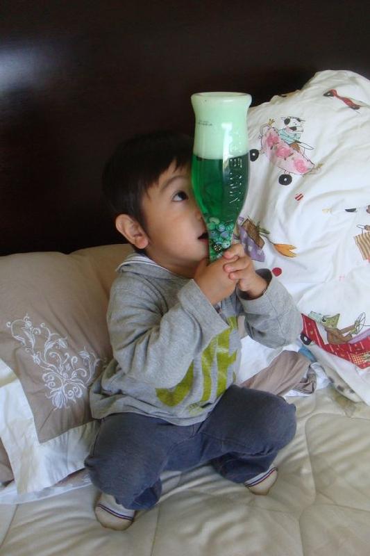 ペットボトルに色水とビーズと洗剤を入れて・・・