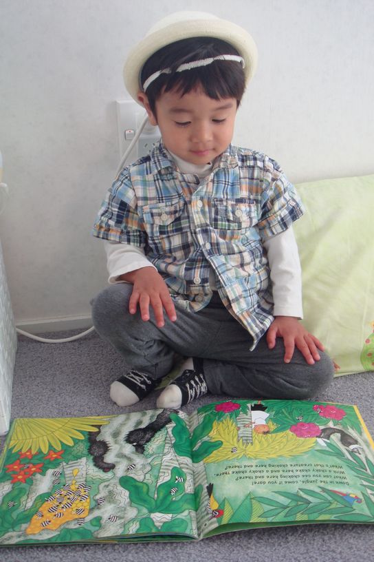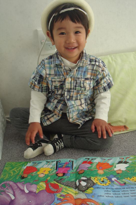 自分で帽子かぶって、最近お気に入りの歌絵本を読んでた。