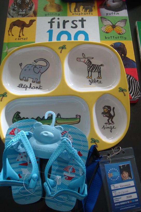 100の生き物全般が載っている本と、プレートとビーチサンダル、それから水族館の年パス
