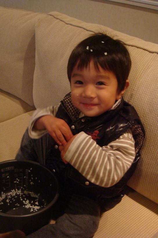 頭にもお米がついてて、