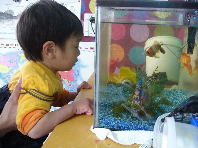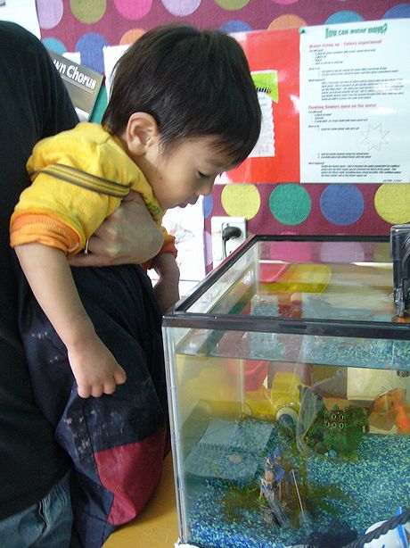 Edwineと一緒に金魚を見て、えさを一緒にやったり