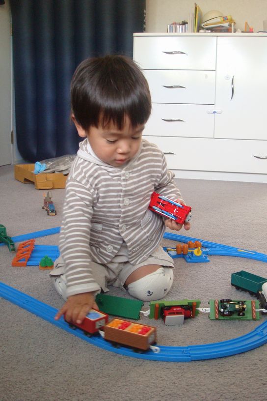『赤ちゃん用の電車だけど、Theoはぴったりはまったわ』だって。