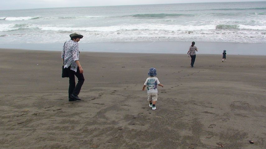 目の前のビーチへ、外房の海は波が高いので、波がひく感じにちょっとびびったセオですが、