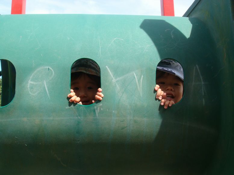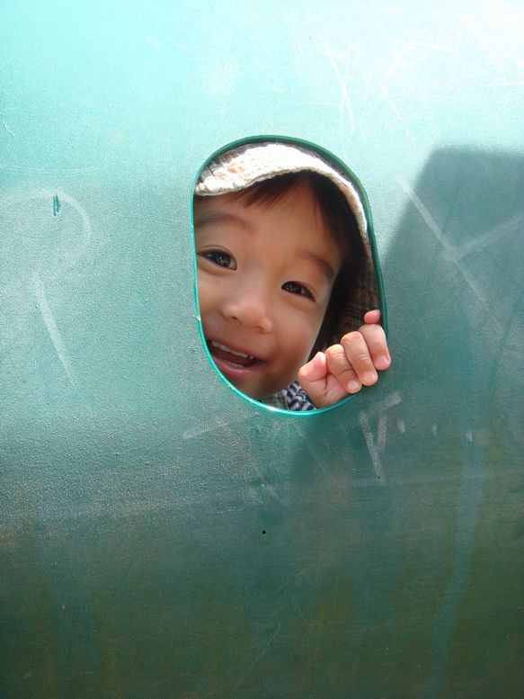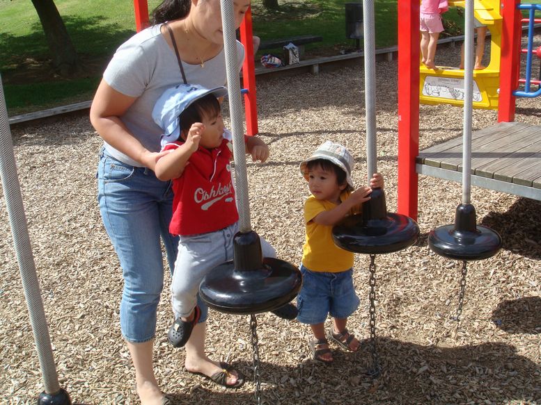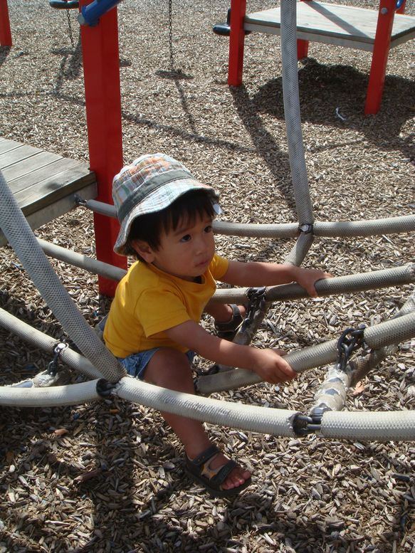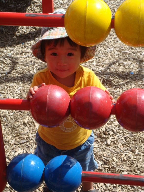 こんな感じの遊具です。木のチップが敷き詰められてますよー。