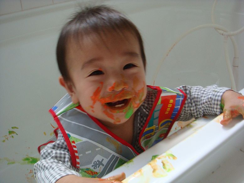 NZの保育園ではハイチェアーのトレイに絵の具を出して、