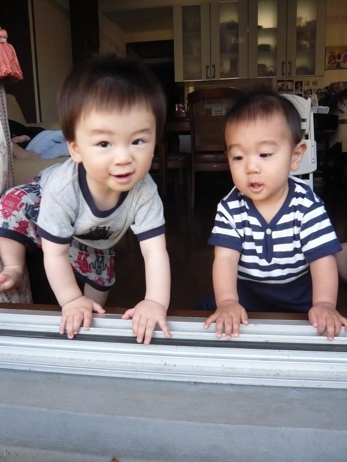 セオに外を見せてあげようと、すかし窓にバギーをくっつけて・・・