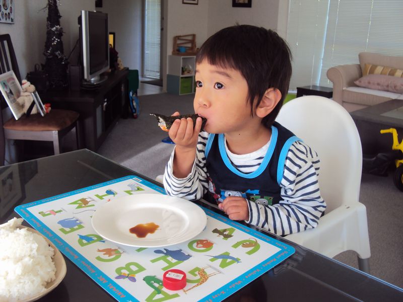 自分でご飯をまきまきして、しょうゆにちゅんちゅんっとつけるのが楽しかったセオ、
