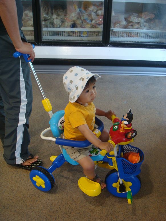 しかも乗るだけでなく押すのも自分でやりたくて、ダディーとマミィーが方向修正したら、起こってストライキ