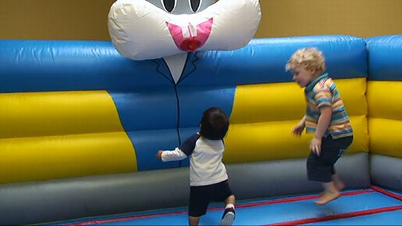 しゃぼんだまマシーンから、たくさんのしゃぼんが出てきて、みんな、きゃいきゃい大喜び